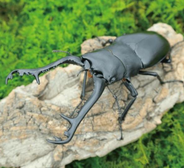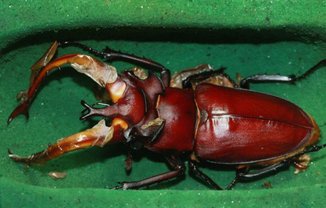 锹形虫的介绍: 锹形虫是昆虫纲,鞘翅目,锹甲科的昆虫,它的身体呈长椭圆形,多是黑色或褐色的大甲虫,体表有金属光泽,头部较大较强,复眼大。 幼虫比较肥大,颜色呈乳白色,一生经历卵、幼虫、蛹、成虫等4个生长阶段,天敌主要有獾、狐、刺猬、喜鹊、啄木鸟等。