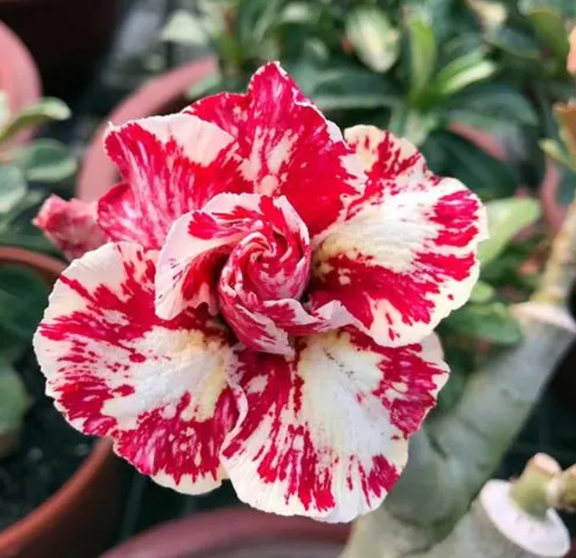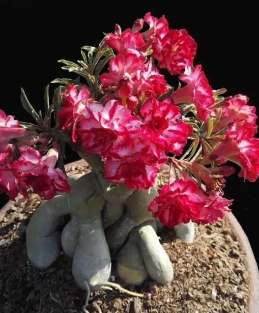 沙漠玫瑰的介绍: 沙漠玫瑰,夹竹桃科天宝花属多肉灌木或小乔木植物,根较粗大,嫩白色,上面有卷须;叶子相对而生,绿色,没有叶柄。 沙漠玫瑰原产非洲的肯尼亚、坦桑尼亚,自二十世纪八十年代引入中国华南地区栽培,在中国大部分地区都有分布。