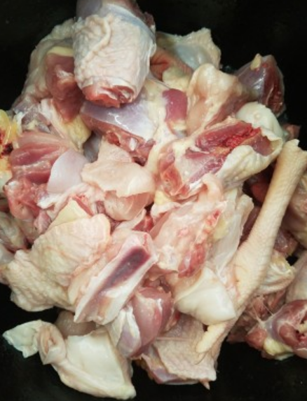 将买回来的老母鸡大卸八块,家里的刀不好用的可以让店家先行加工,然后用水冲洗干净。