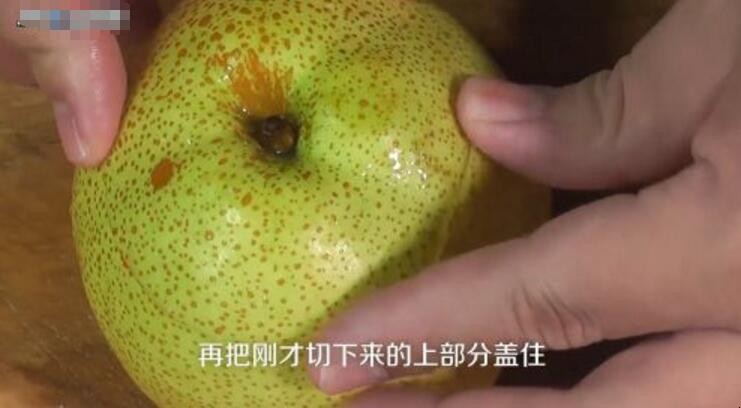 2、将冰糖放在梨子中间,再把刚切下来的上部分盖住。