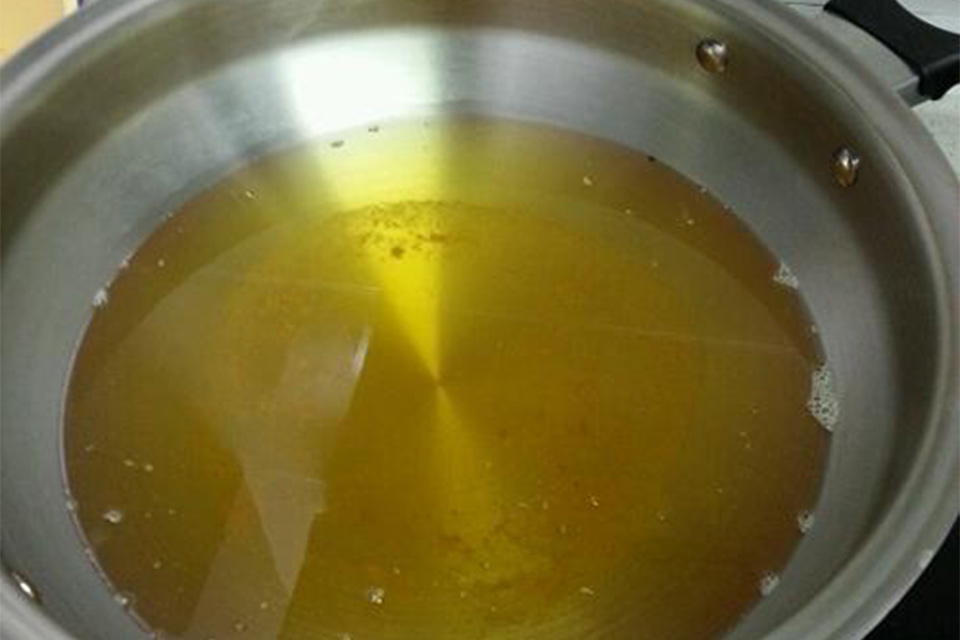 2、炸猪油:将切成小块的猪板油、肥肉放到炒锅中,加小半碗水后用大火烧开,转小火熬至油全部出来,不用盖盖子。