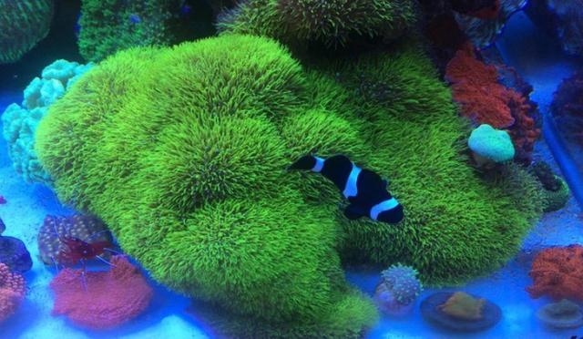 草皮珊瑚简介 通常呈绿色、棕色,每个水螅体上有八个触手,是一种温和的珊瑚,不会伤害其它珊瑚,但是会被其它攻击性强的珊瑚攻击,属于群居动物,大的群落在一起像地毯一样,十分好看。草皮珊瑚通过每周喂食,会生长的十分迅速。