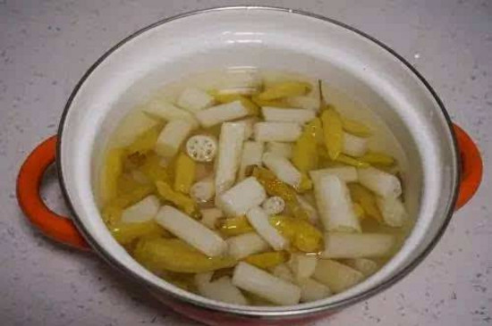 烧一锅开水,并在水里放一勺盐,放入姜片、少量花椒。等水开了放入切好的藕带,水再次烧开后关火。 步骤4