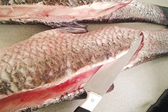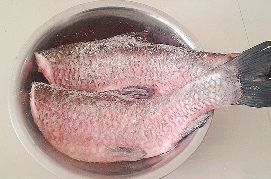1、准备好食盐和鱼,先处理鱼,去掉鱼头,刮去鱼鳞,用刀从鱼肚处划开,除去内脏,用水反复的清洗干净,注意别切到手。