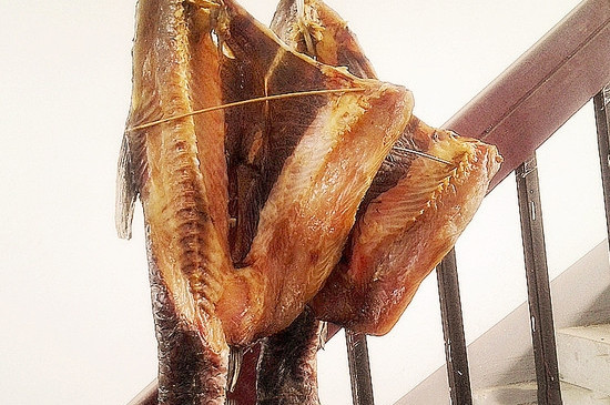 4、一个星期左右鱼就腌制好了,此时将鱼取出用绳子穿起来,挂在阴凉通风的地方阴干,大概在10~15天,咸鱼就腌制好了。 |