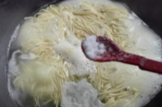 待开水煮面条1~2分钟后转为中或,接下来把盐、猪油、盐、五香粉依次放入,除了五香粉半勺,其它调料各一勺即可。用锅铲轻轻的搅拌面条,让调料能够均匀的散开,注意搅拌时用力不宜过大,避免将面条搅断。 步骤四