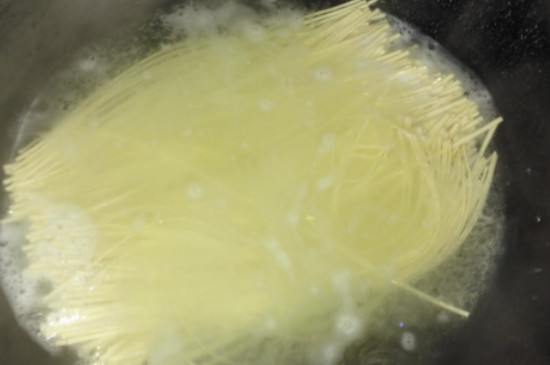 将鸡蛋捞出后,在锅中倒入适量的水,水不宜过多,大概800ml即可,然后开大火烧水。大概2~3分钟,水烧开之后放入面条,面条最好不要一次性放完,小把小把的放,这样可以保证面条下锅后不粘在一起。 步骤三