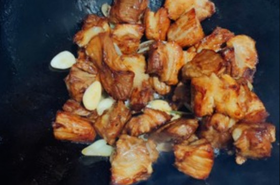 2、起锅烧油放入适量冰糖后,炒至冰糖融化,再倒入牛腩翻炒至牛腩上色。之后加入切好的葱、姜、蒜、八角、桂皮炒香,加入牛腩焯水的汤并调入少量盐煮开。
