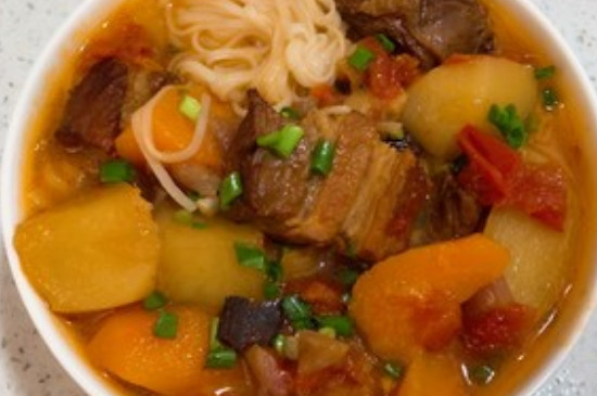 3、倒入高压锅内压45分钟。重新起锅烧油并放入胡萝卜、洋葱和西红柿,炒至番茄变软后,加入少量生抽、盐、土豆以及之前焯烫的汤汁,烧开后关火,再倒入高压锅内压25分钟,出锅前撒上葱花即可。 |