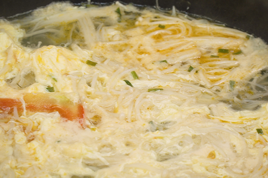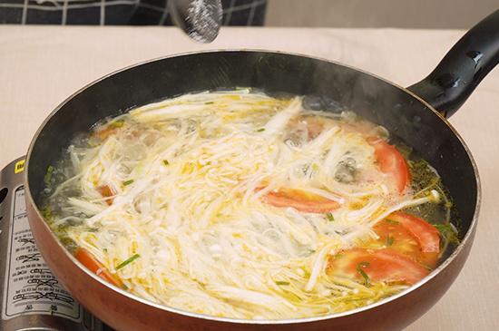 4、蛋液成型、金针菇完全煮熟后,即可出锅,撒上适量葱花,一份美味的番茄金针菇汤就做好了。 |