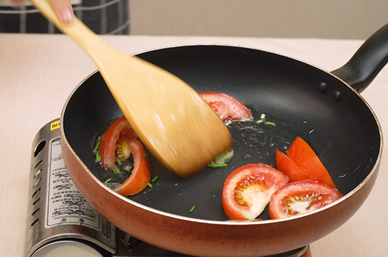 2、起锅烧油,油热后放入葱花炒出香味,再放入西红柿炒烂出汤汁。