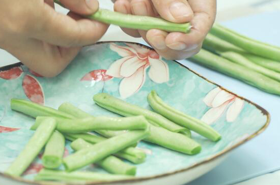 1、把豆角放入清水中浸泡7~8分钟,换水清洗干净后,摘成6~7cm小段大小。