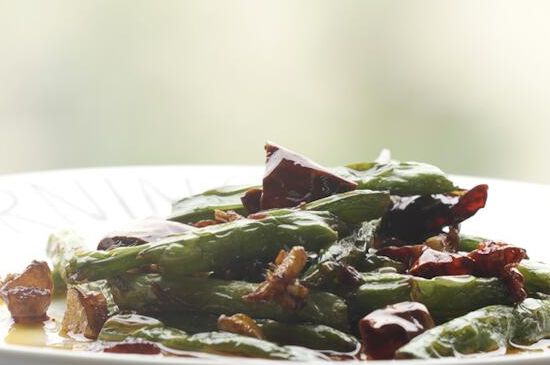 将豆角浸泡7~8分钟并换水清洗干净后摘成6~7cm每段大小,把花椒放入油锅内炒出香味后捞出,再放入大蒜炒至爆香,之后依次放入豆角段、盐等辅料翻炒均匀,转小火炒干豆角水分后,再放入生姜和味精翻炒均匀,就可以做成味美的干煸豆角。 干煸豆角的做法