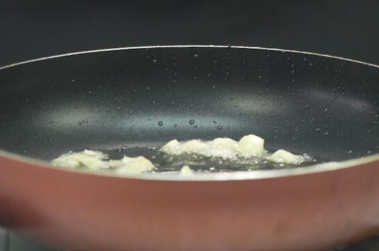 2、起锅烧油后,把花椒粒放入炒出香味,再将花椒捞出,把拍扁的大蒜放入锅内炒至爆香。