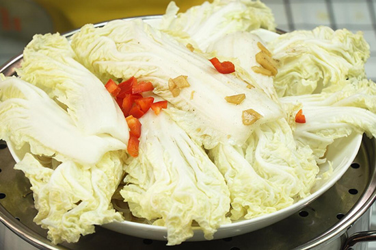 5、锅里水烧开后将娃娃菜放入蒸屉中,加入红尖椒碎,蒸20分钟时间,随后放入一些剁碎的香葱,美味的蒜蓉粉丝娃娃菜就出锅了。 |