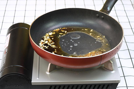 2、起锅烧油,放入蒜蓉爆炒,加入生抽以及清水。