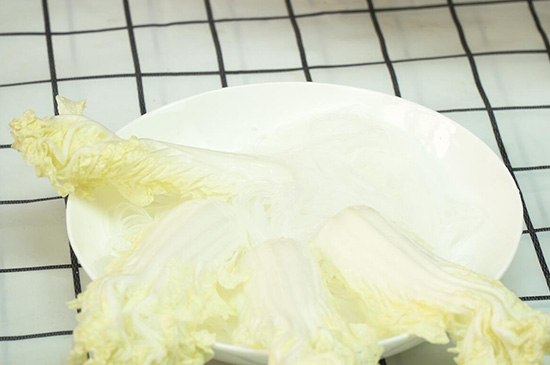 4、将泡软的粉丝铺在盘底,摆放娃娃菜,浇上蒜蓉泥以及胡椒粉提鲜。