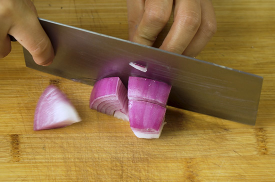 1、先将洗干净的瘦肉切成片状,再将菜花和洋葱清洗后切成片。