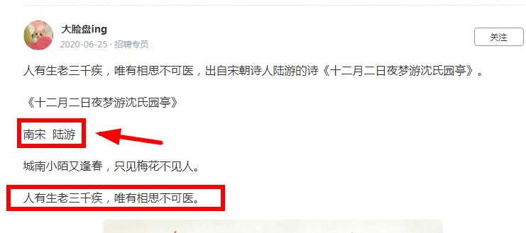 咦,陆游有写这样的一句诗吗,小编记得陆游是写过《十二月二日夜梦游沈氏园亭》的,但是好像没听说有这一句诗啊,于是小编又查询了一下陆游的《十二月二日夜梦游沈氏园亭》全诗内容,全诗内容如下: 城南小陌又逢春,只见梅花不见人。 玉骨久沉泉下土,墨痕犹锁壁间尘。 这才是陆游的《十二月二日夜梦游沈氏园亭》的全诗内容啊,并没有什么“人有生老三千疾,唯有相思不可医”啊,于是小编又查询了一下,确定了又确定之后,终于知道了真相。