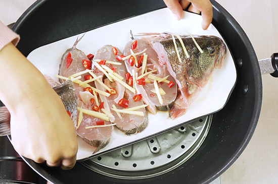 3、将鲈鱼放入锅中隔水大火蒸6~8分钟。