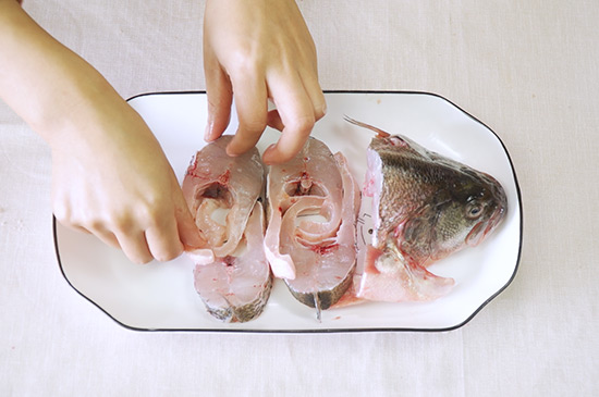 1、将鲈鱼清洗干净后,切成段状装入盘中。