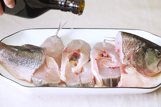 准备食材:鲈鱼、蒸鱼豉油、料酒、姜丝、椒片、鸡粉、食盐。
