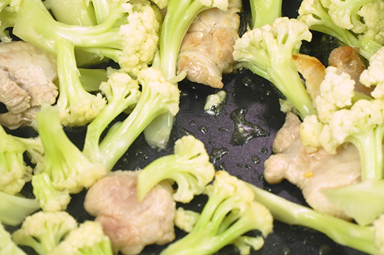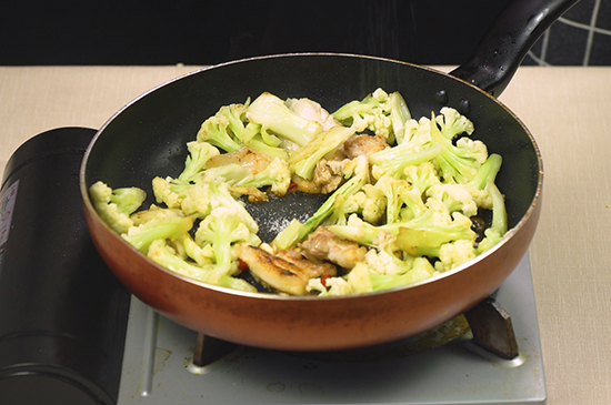 3、菜花铺匀在锅内,开大火煎制30秒后翻炒几下,再盖上锅盖转中火焗30秒。