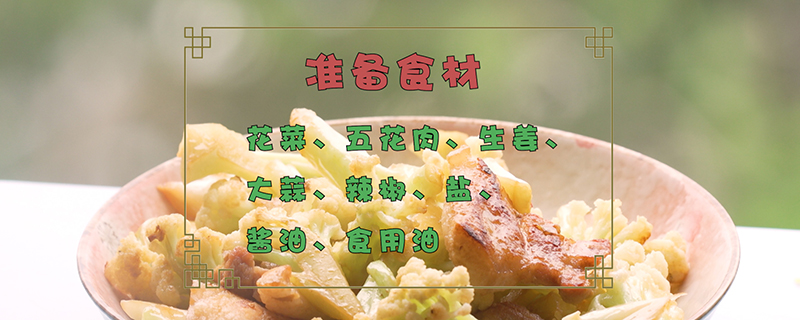 准备食材:花菜、五花肉、生姜、大蒜、辣椒、盐、酱油、食用油。
