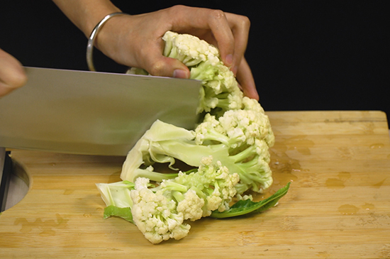 4、菜花有点焦色后放入辣椒和大蒜翻炒均匀,再依次放入生抽、盐炒匀,即可做成美味的干煸花菜。 |