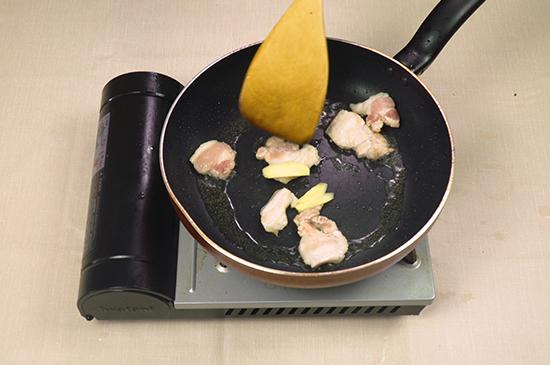 2、起锅烧油把五花肉片放入小火煸炒出油,再放入生姜炒出香味。
