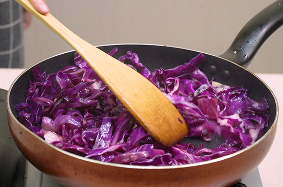 4、紫甘蓝翻炒变软后,按照个人口味加入适量米醋搅拌均匀,一份美味的清炒紫甘蓝就做好了。 |
