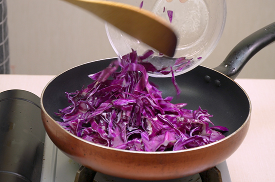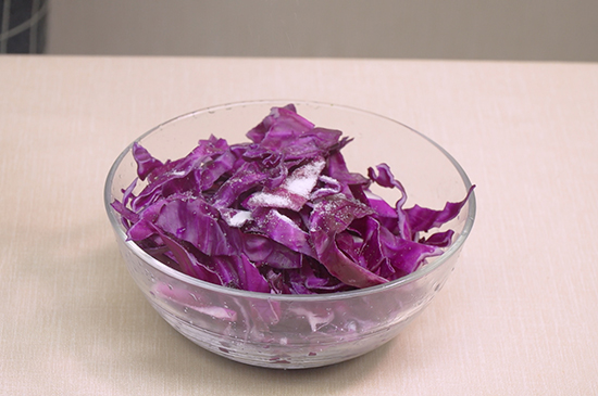 用盐、五香粉、大蒜和食用油与紫甘蓝丝腌制5分钟后,将腌制好的紫甘蓝丝放入油锅内翻炒1分钟左右。紫甘蓝丝翻炒变软后,加入适量米醋搅拌均匀进行调味,就可以做出美味的清炒紫甘蓝。 清炒紫甘蓝的制作方法