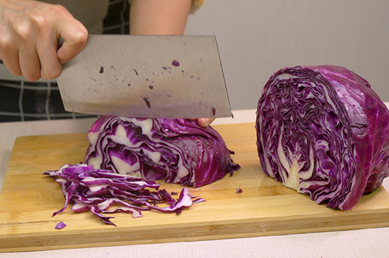 1、紫甘蓝用水清洗干净后切成丝,大蒜拍碎备用。