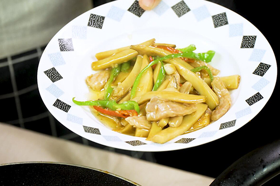 4、把杏鲍菇扒到锅内一边,放入腌好的肉条翻炒几次后与杏鲍菇一起翻炒,最后放入青椒炒熟即可出锅,一份美味的杏鲍菇炒肉就做好了。 |