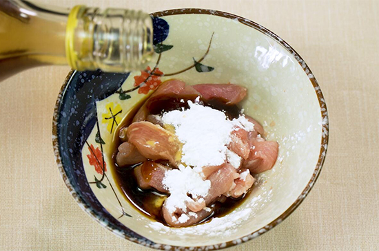 2、猪肉条用盐、酱油、蚝油、生粉、料酒抓匀腌制几分钟。