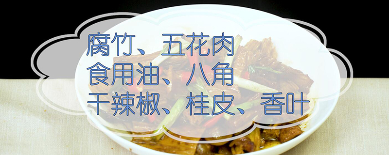 准备食材:腐竹、五花肉、食用油、八角、干辣椒、桂皮、香叶、冰糖、大蒜籽、蒜苗、生姜、鸡精、胡椒粉、盐。