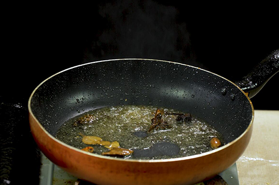 3、水炒干后转大火炒出焦糖色,倒入八角、桂皮、香叶、干辣椒和适量水,直至水分再次炒干,香料炒出香味。