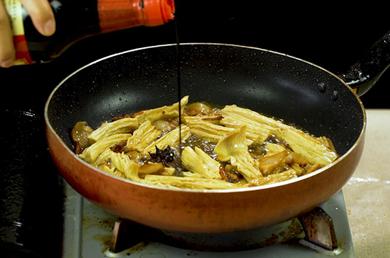 5、上色后加水与腐竹持平后,加入盐、姜片、大蒜籽盖锅大火焖5分钟,再开锅依次加入胡椒粉、蒜苗和鸡精翻炒均匀,一份美味的红烧腐竹就做好了。 |