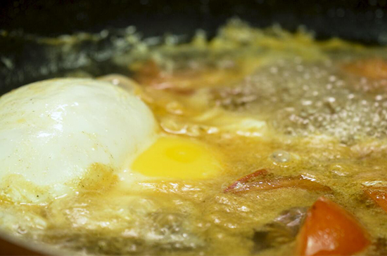 3、汤汁略微收浓后加入热水大火煮开,再转小火烧制,同时往锅内打入一个鸡蛋。