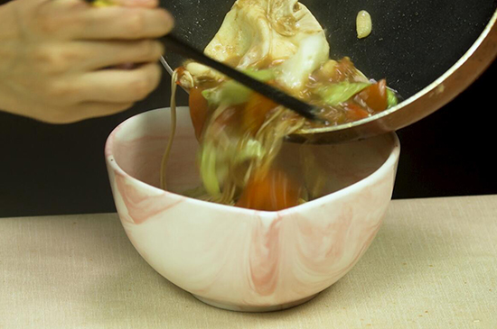 4、鸡蛋完全凝固后转中大火,再放入面条、盐、胡椒粉。面煮熟后放青菜、生抽和香油,搅匀后即可出锅装入碗内,一份美味的酸汤空心挂面就做好了。 |