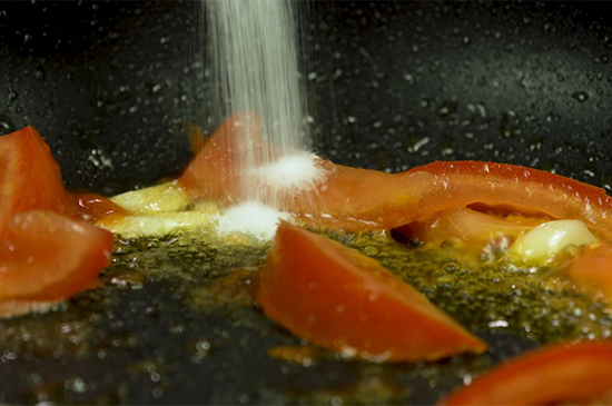 2、起锅烧油,油热后放入大蒜片炒出香味,放入番茄泥翻炒几分钟后,再放入番茄酱、白砂糖继续翻炒。