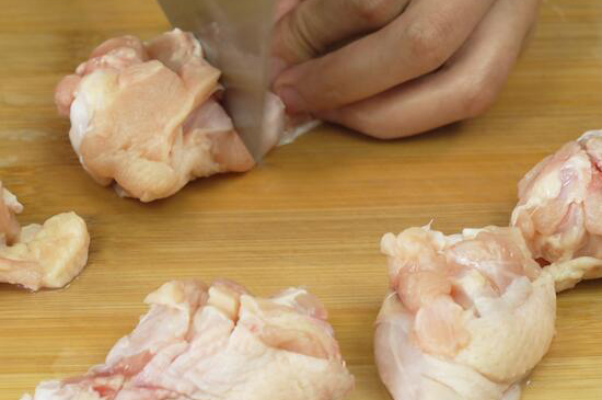 1、鸡腿洗净后表面划几刀,放入热水内浸泡去除血水。生姜切片,小葱切段备用。