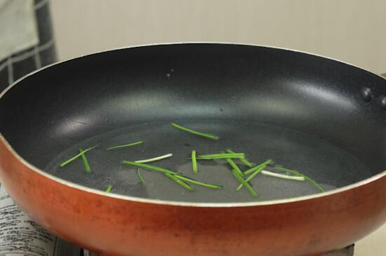 3、起锅烧水,在锅底铺上小葱和适量姜片,再把腌好的鸡腿、腌制的料汁和少量清水倒入锅内中火熬制。