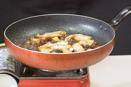 4、打开锅盖依次加入适量甜辣酱、白糖,晃过炒匀后,盖锅焖煮2~3分钟入味。