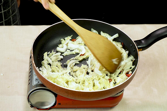 3、倒入包菜不断翻炒,直到炒至包菜断生。