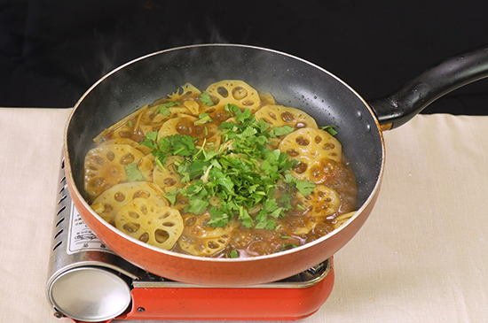 4、之后倒入生抽、糖、盐、老抽翻炒片刻后,放入香菜翻炒,一份美味的清炒藕片就做好了。 |