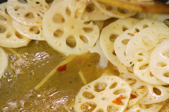 起锅烧油放入切好的姜、蒜炒出香味后,放入藕片翻炒1分钟左右,再放入适量豆瓣酱和水大火持续翻炒10分。最后倒入生抽、糖、盐、老抽翻炒片刻,放入香菜翻炒均匀,一份美味的清炒藕片就完成了。 清炒藕片的制作方法