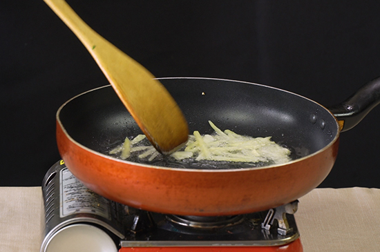 2、起锅烧油,油热后放入切好的姜、蒜炒出香味,再放入藕片翻炒1分钟左右。