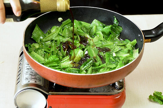 3、油麦菜杆翻炒变软后,将适量蚝油、生抽、盐放入锅内大火翻炒2分钟。