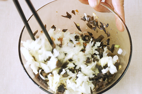4、切好的大白菜与木耳放入肉馅内,再次搅拌均匀后,一份鲜香的白菜猪肉饺子馅就做好了。 |
